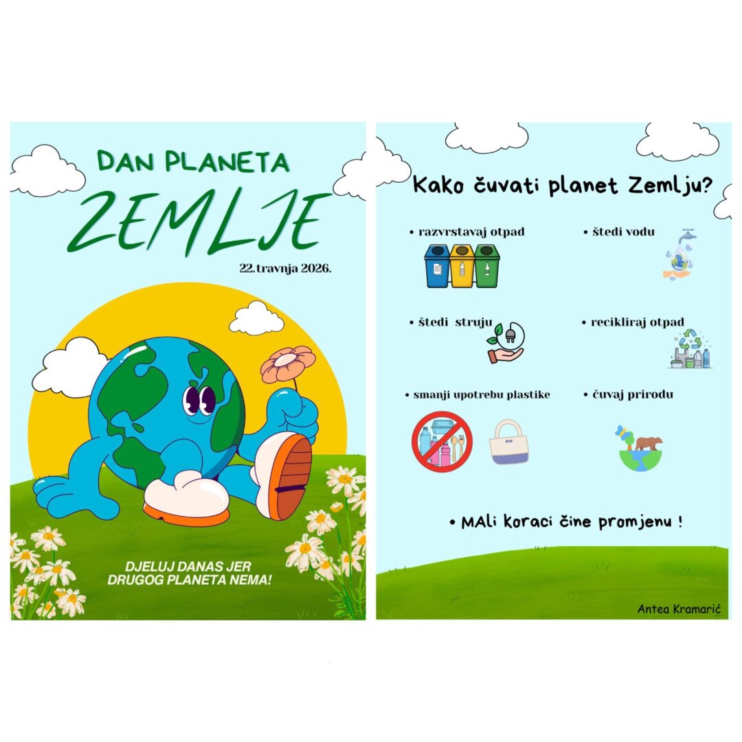 Sad već tradicionalno treću godinu za redom obilježili smo Dan planeta Zemlje izradom i natjecanjem za najbolji digitalni materijal. Učenici su samostalno odabrali koju vrstu materijala će izraditi, a zatim je nakon glasanja odlučeno koji će biti najbolji.
